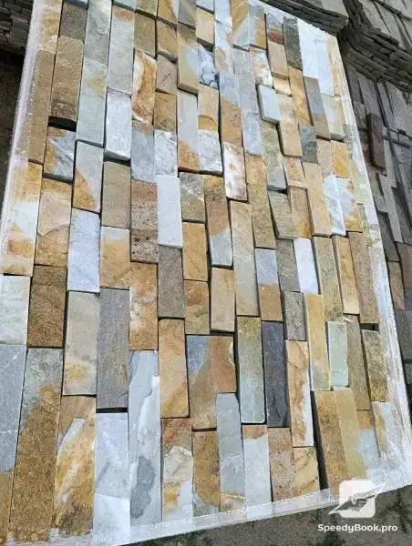 A natural stone with warm honey-yellow and silver-grey hues. The straight machine-cut edges give a tidy, modern look, while the sturdy structure ensures durability against cold, sun and moisture. Suitable for facades and interiors. 🏠