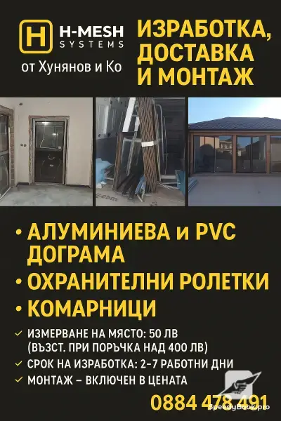 - H-Mesh Systems 📞 0884 478 491 Линейка продукции Hunyanov & Co 💬 Все цены окончательные и включают установку! 🪟 Москитные сетки Тип москитной сетки Размер (стандарт) Цена с установкой Описание Стационарная 70×120 см 51 BGN Алюминиевый профиль + стекловолокно Распашная (дверь) 80×200 см 91 BGN С магнитом и ручкой Роликовая (вертикальная) 70×130 см 97 BGN С кассетой и направляющими Роликовая (горизонтальные) 90×210 см 107 BGN Идеально подходят для балконных дверей 🌞 Жалюзи (внутренние) Тип жалюзи Цвет/тип Цена с установкой Горизонтальные алюминиевые Белые / цветные 39 / 41 BGN/м² Рулонные жалюзи (Мини / Стандарт) Ткань / однотонная 52 - 77 BGN/шт Жалюзи День и Ночные Ткань 87 - 100 лв/шт Вертикальные Ткань Цветные от 31.50 лв/м² 💵 Дополнительные условия.